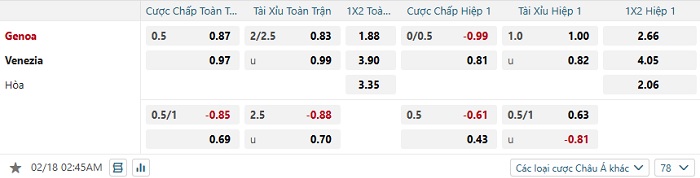 Tip kèo Châu Á hiệp 1 Genoa vs Venezia