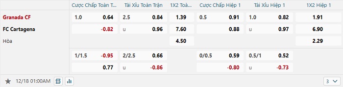 Tip kèo Châu Á hiệp 1 Granada vs Cartagena