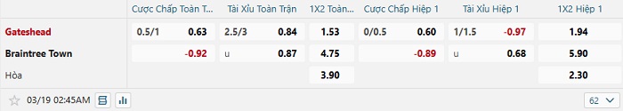 Tip kèo Châu Á hiệp 1 Gateshead vs Braintree Town