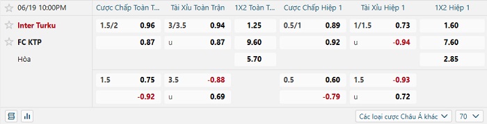 - Tip kèo cá cược Châu Á hiệp 1: Chọn Inter Turku -1/4
