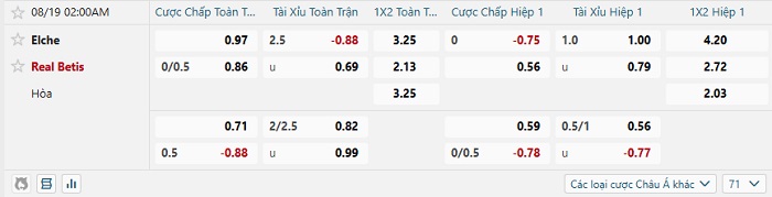 Tip kèo Châu Á full trận Elche vs Real Betis