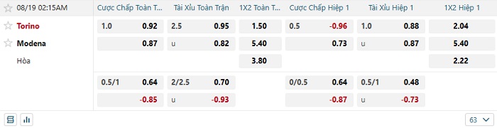 Tip kèo Châu Á hiệp 1 Torino vs Modena
