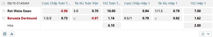 - Dự đoán tỷ số hiệp 1: Rot Weiss 0 – 2 Dortmund