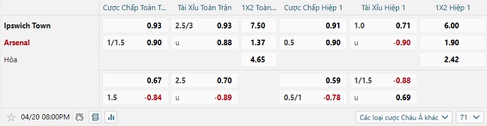Tip kèo Châu Á hiệp 1 Ipswich vs Arsenal