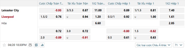 Tip kèo Châu Á hiệp 1 Leicester vs Liverpool