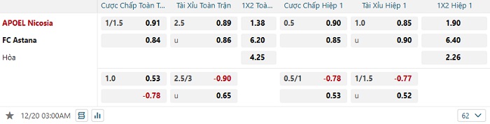 Tip kèo Châu Á hiệp 1 APOEL vs Astana