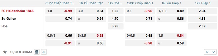 Tip kèo Châu Á hiệp 1 Heidenheim vs St. Gallen