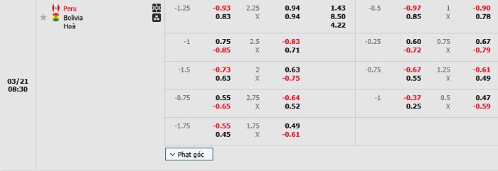 Tip kèo Châu Á hiệp 1 Peru vs Bolivia