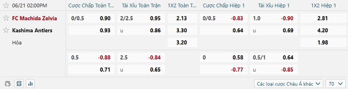 Tip kèo Châu Á hiệp 1 Machida Zelvia vs Kashima