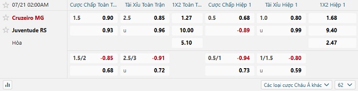 - Dự đoán tỷ số hiệp 1: Cruzeiro 1 – 0 Juventude