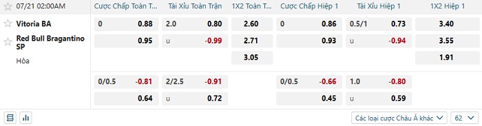Tip kèo Châu Á full trận Vitoria vs Bragantino