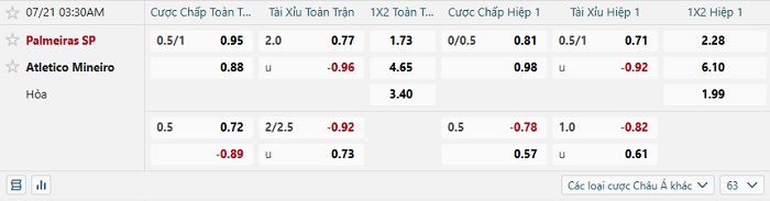 Tip kèo Châu Á full trận Palmeiras vs Mineiro