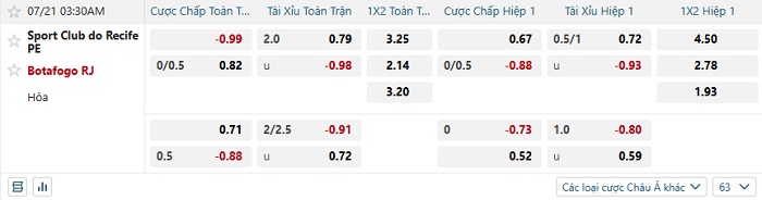 Tip kèo Châu Á full trận SC Recife vs Botafogo