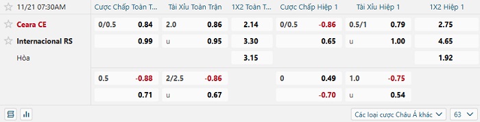 Tip kèo Châu Á full trận Ceara vs Internacional