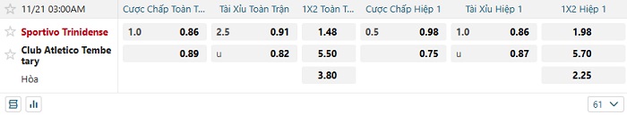 Tip kèo Châu Á hiệp 1 Trinidense vs Atletico Tembetary