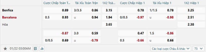 Tip kèo Châu Á hiệp 1 Benfica vs Barcelona