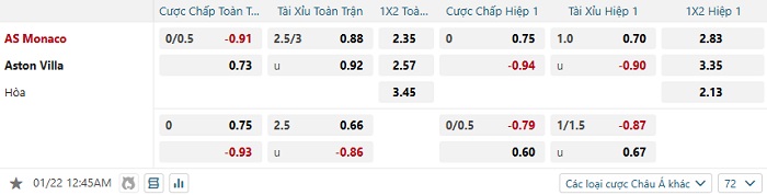 Tip kèo Châu Á hiệp 1 Monaco vs Aston Villa