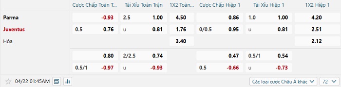Tip kèo Châu Á hiệp 1 Parma vs Juventus
