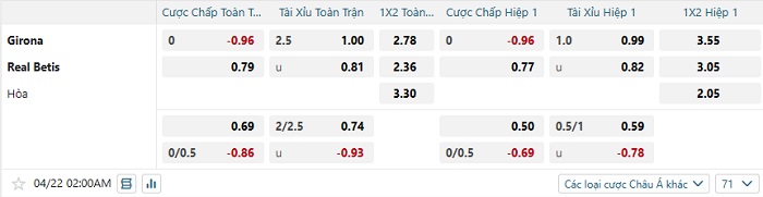 Tip kèo Châu Á hiệp 1 Girona vs Real Betis