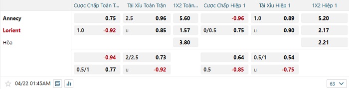 Tip kèo Châu Á hiệp 1 Annecy vs Lorient