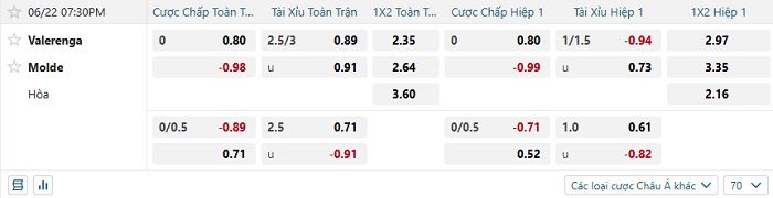 Tip kèo Châu Á full trận Valerenga vs Molde