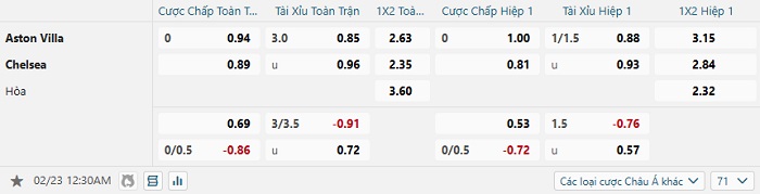 Tip kèo Châu Á full trận Aston Villa vs Chelsea