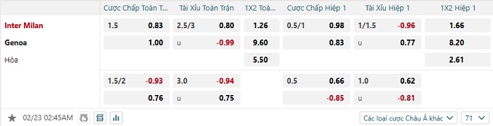 Tip kèo Châu Á hiệp 1 Inter Milan vs Genoa