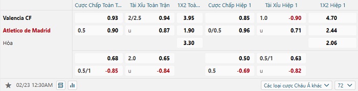 Tip kèo Châu Á full trận Valencia vs Atletico Madrid