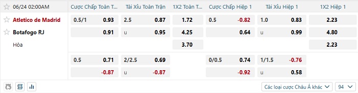 Tip kèo Châu Á full trận Atletico Madrid vs Botafogo