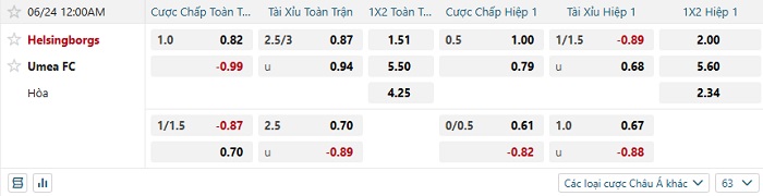 Tip kèo Châu Á hiệp 1 Helsingborgs vs Umea