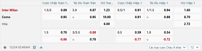 Tip kèo Châu Á hiệp 1 Inter vs Como