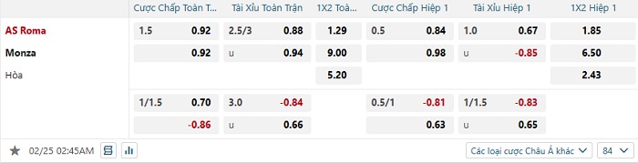 Tip kèo Châu Á hiệp 1 Roma vs Monza