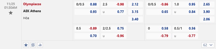 Tip kèo Châu Á full trận Olympiacos vs AEK Athens