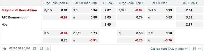 Tip kèo Châu Á full trận Brighton vs Bournemouth