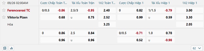 Tip kèo Châu Á hiệp 1 Ferencvarosi vs Plzen