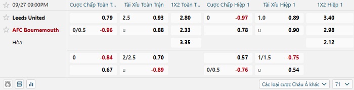 Tip kèo Châu Á hiệp 1 Leeds vs Bournemouth