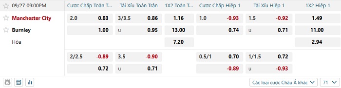 Tip kèo Châu Á hiệp 1 Man City vs Burnley