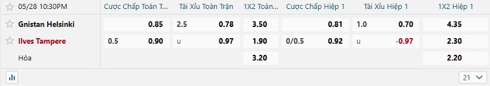 Tip kèo Châu Á full trận Gnistan Helsinski vs Ilves Tampere