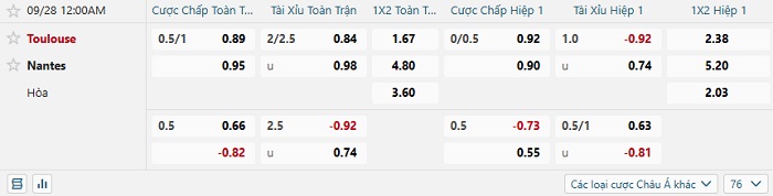 Tip kèo Châu Á hiệp 1 Toulouse vs Nantes