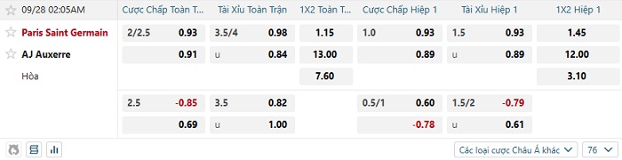 Tip kèo Châu Á hiệp 1 PSG vs Auxerre