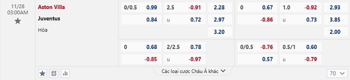 Tip kèo Châu Á full trận Aston Villa vs Juventus