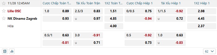 Tip kèo Châu Á full trận Lille vs Dinamo Zagreb
