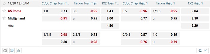 Tip kèo Châu Á full trận Roma vs Midtjylland