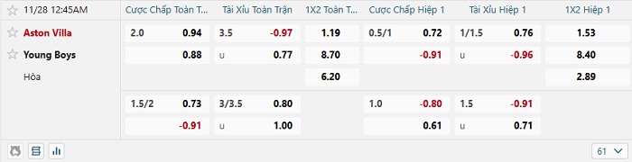 Tip kèo Châu Á hiệp 1 Aston Villa vs Young Boys