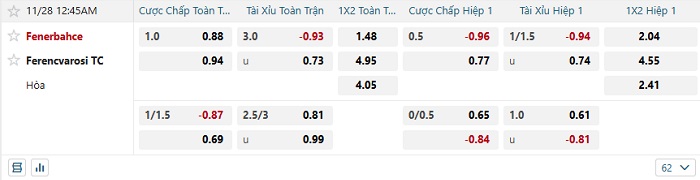 Tip kèo Châu Á hiệp 1 Fenerbahce vs Ferencvarosi