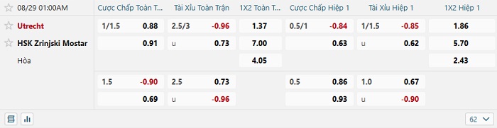 Tip kèo Châu Á hiệp 1 Utrecht vs Zrinjski