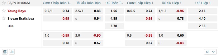 Tip kèo Châu Á hiệp 1 Young Boys vs Slovan Bratislava