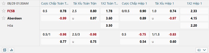 Tip kèo Châu Á hiệp 1 FCSB vs Aberdeen