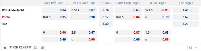 Tip kèo Châu Á hiệp 1 Anderlecht vs Porto