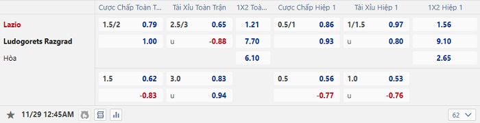 Tip kèo Châu Á hiệp 1 Lazio vs Ludogorets